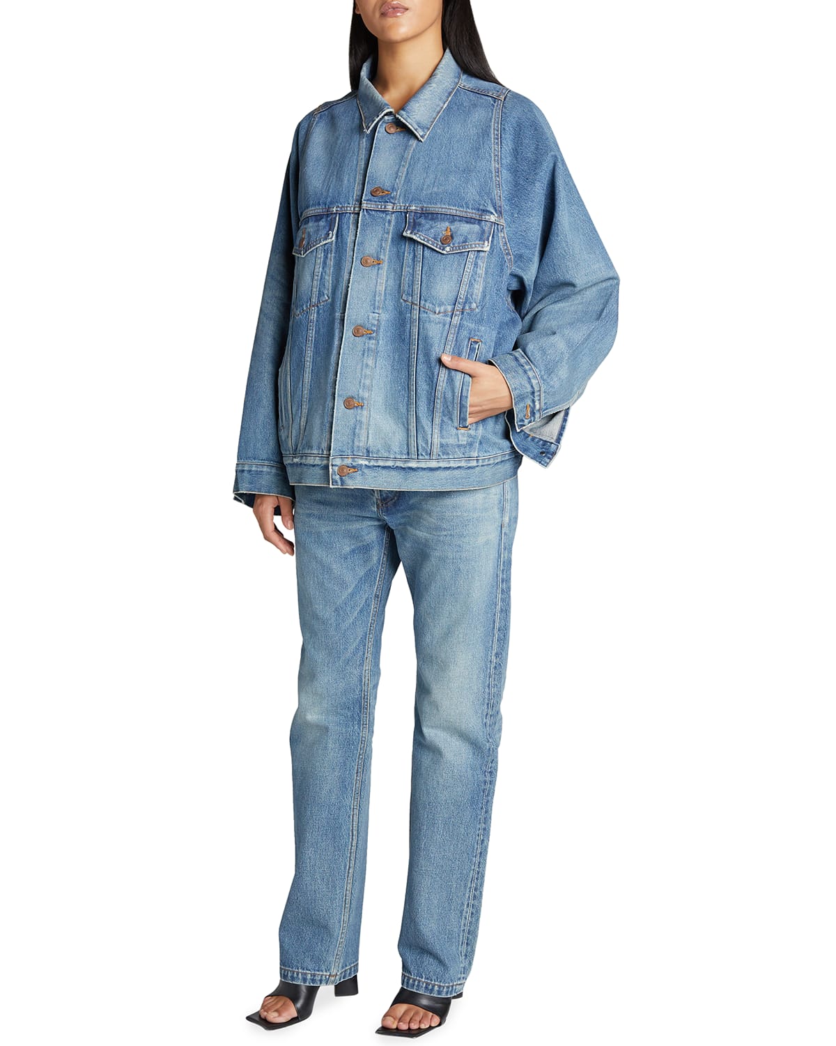 Balenciagas take on the classic denim jacket is suggestive of the brands contemporary design approach with distressing adding a sleek finish to its silhouette. We love the classic denim hue of our wide sleeve jacket. SJYP Wide-Sleeve Denim Jacket.